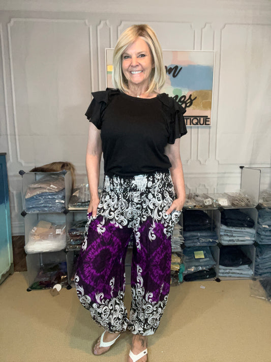 Candelabra Tie Dye Smocked Waist Elastic Hem Pants PURPLE