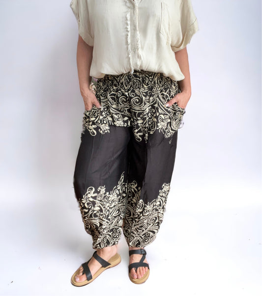 Candelabra Smocked Waist Jewel Toned Pants Black