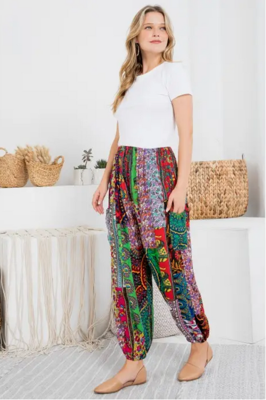 Festival Patchwork Smocked Waist Rayon Pants