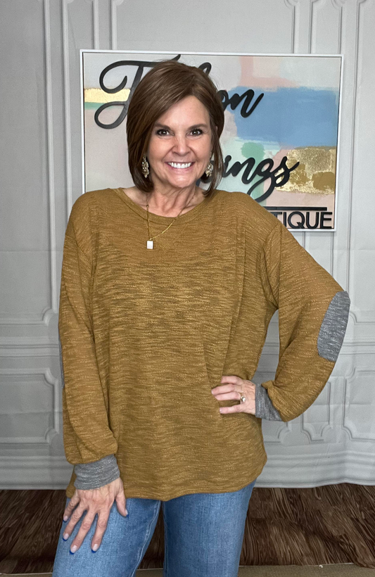 SAMPLE SALE: LARGE TEXTURED TOP WITH ELBOW PATCHES IN CAMEL