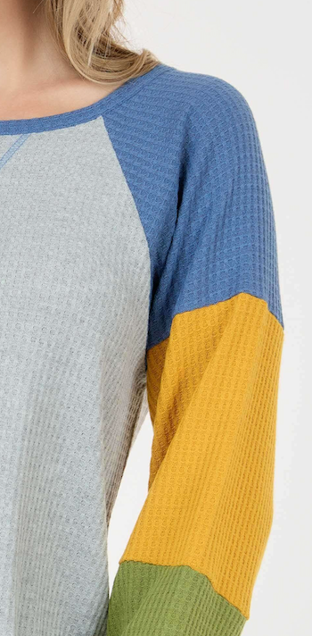Long Sleeve Color Contrast Round Neck Waffle Top Heather Grey